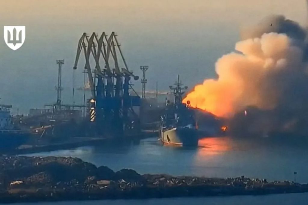 Новітній малий ракетний корабель проєкту «Каракурт», здатний нести вісім ракет «Калібр», був уражений ракетами на суднобудівному заводі «Залив» у Керчі. Корабель ще навіть не був офіційно прийнятий до складу флоту. Фотографії після удару зафіксували значні пошкодження центральної частини корпусу та пускових установок.